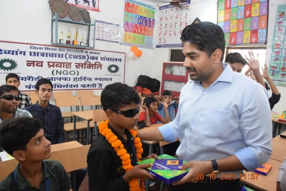 प्रकाश के पर्व दीपावाली के शुभ अवसर पर कलेक्टर गौरव बैनल ने दिव्यांग बच्चो के साथ दीपावली मनाई। उन्होंने सीडब्ल्यूएसएन छात्रावास बैढ़न नव प्रवाह समिति द्वारा संचालित छात्रावास में पहुचकर दिव्यांग बच्चो का कुशल क्षेम जाना एवं मिठाई खिलाकर उनका मुह मीठा किया। कलेक्टर ने बच्चो से रूबरू होकर उनके पाठन पाठन की जानकारी ली। दिव्यांग बच्चो का फूल माला पहनाकर उनकी हौसलाफजाई करते हुयें कहा कि आप की शिक्षा, रहन सहन की जिम्मेदारी मेरी है आपकी जो भी मूलभूत जरूरते होगी उसे पूरा किया जायेगा। कलेक्टर ने बच्चों से संवाद करते हुए पूछा कि आप सब क्या बनना चाहते ही जिस बच्चो ने अपने रूचि अनुसार किसी ने बताया कि मुझे डाक्टर बनना है, शिक्षक बनना है। पुलिस अधिकारी बनाना है। कलेक्टर ने बच्चों से कहा कि अगर आप लोगो को किसी भी प्रकार समस्या हो रही है तो आप मुझे बता सकते है। संवाद के दौरान बच्चों ने कलेक्टर से कम्प्युटर सिस्टम की मांग की जिस पर कलेक्टर द्वारा बच्चों को कंप्यूटर मुहैया कराने के निर्देश दिये और बच्चों को आश्वस्त किया कि जल्दी ही उनके पास कंप्यूटर होगा।
